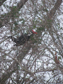 We have enjoyed watching this Redheaded Woodpecker for several days now. He is eating the berries left on the tree outside our bedroom window. Our dog, Buster, has even been fascinated by him standing down below watching him. He isn't pounding any holes, just enjoying the berries. He hangs on upside down and shakes the berries until the pop off. It seems an unusual position for this type of bird!